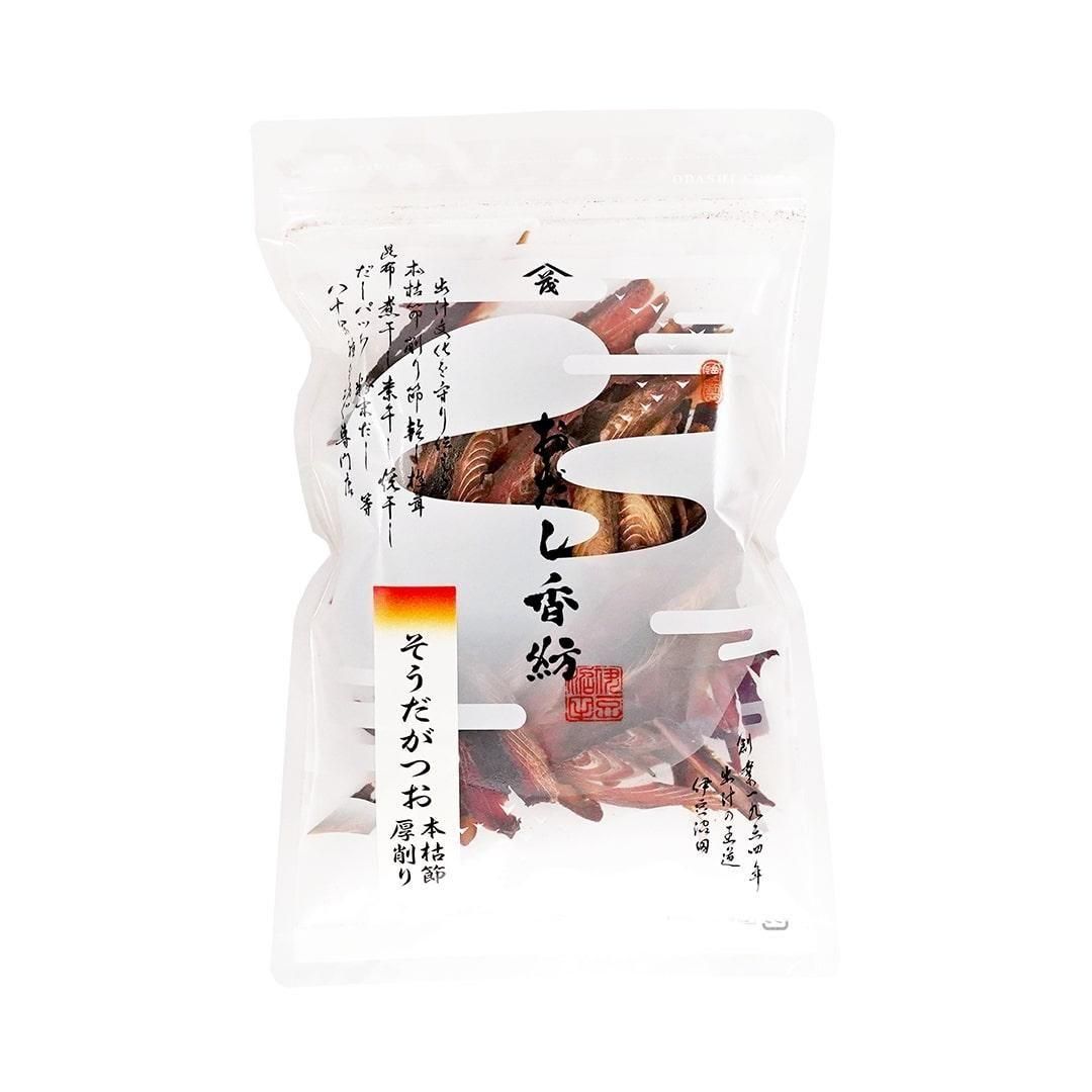 おだし香紡には、香り高いかつお本枯節厚削りとコクのある宗田がつお節厚削り、この2つをブレンドした蕎麦だし厚削りの3種の厚削りがあります。料理に加えるコクを重視したい方には、宗田がつお節厚削りがおすすめです。主張の強い調味料を使っても負けない存在感のあるおだしは、濃い味つけの麺つゆやおでんなどによく合います。宗田がつおは血合い(ちあい)が多いため、かつお節と比べて濃厚なコクと濃い色のおだしがとれます。一方で、香りを重視したい方にはかつお本枯節厚削りが選ばれています。コクと香りのバランスがとれた蕎麦だし厚削りは、おだし香紡のノウハウを活かした使い勝手のよい万能出汁が取れるブレンドです。厚削り初心者の方におすすめしています。
