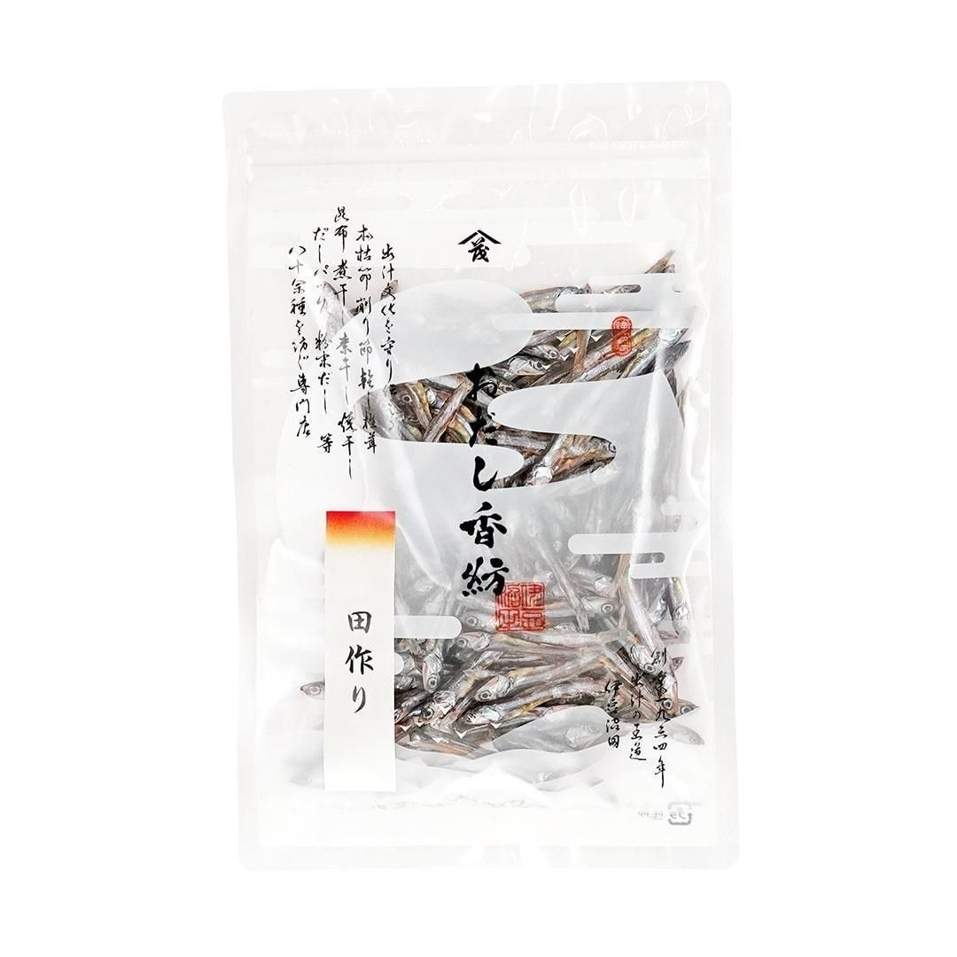 本製品の原材料は、関東で一般的なかたくちいわしの素干しです。 その昔、いわしを田んぼの肥料にしたところ大変豊作になったことから、田を作ることにちなみ「田作り」と呼ばれるようになりました。 五穀豊穣の願いを込めてお正月のおせち料理に並べられます。 見た目は煮干しのようですが、煮ずに干して乾燥させています。必ず火を入れてお召し上がり下さい。