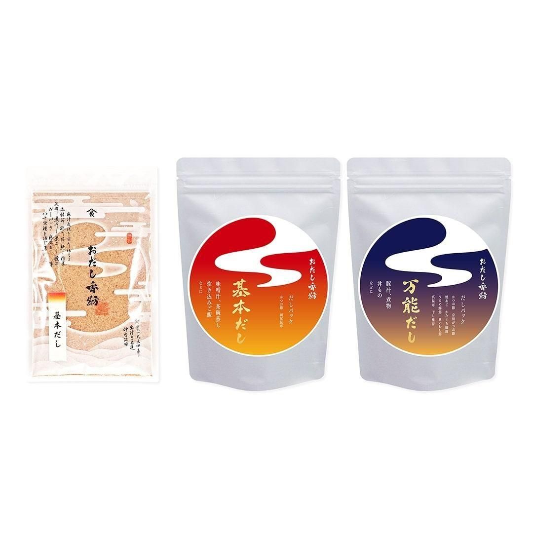 簡単に生活に取り入れられるおだし3点のセットです。「基本だし(だしパック)」と「万能だし(だしパック)」はお味噌汁や煮物に。「基本だし(粉末だし)」は具材と一緒に煮出したり、冷奴にふりかけたり。